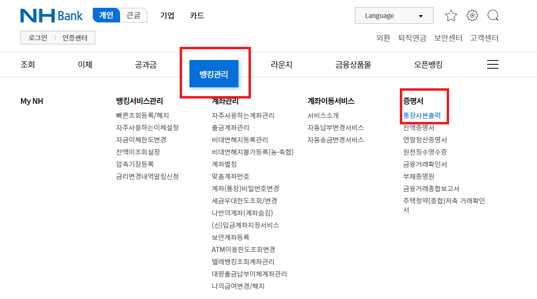 3. 뱅킹 관리 메뉴에서 증명서 - 통장사본 출력을 클릭합니다.