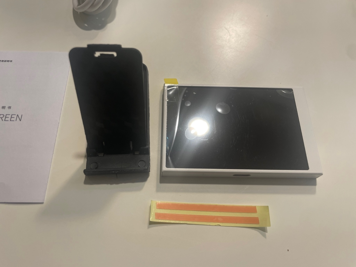 제품 구성은 제품 LCD 받침대 , IPS 3.5인치 디스플레이 , C타입의 USB 케이블 , 양면 테이프같이 생긴 테이프로 구성되어있습니다.
