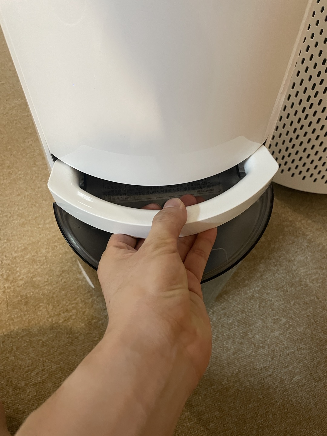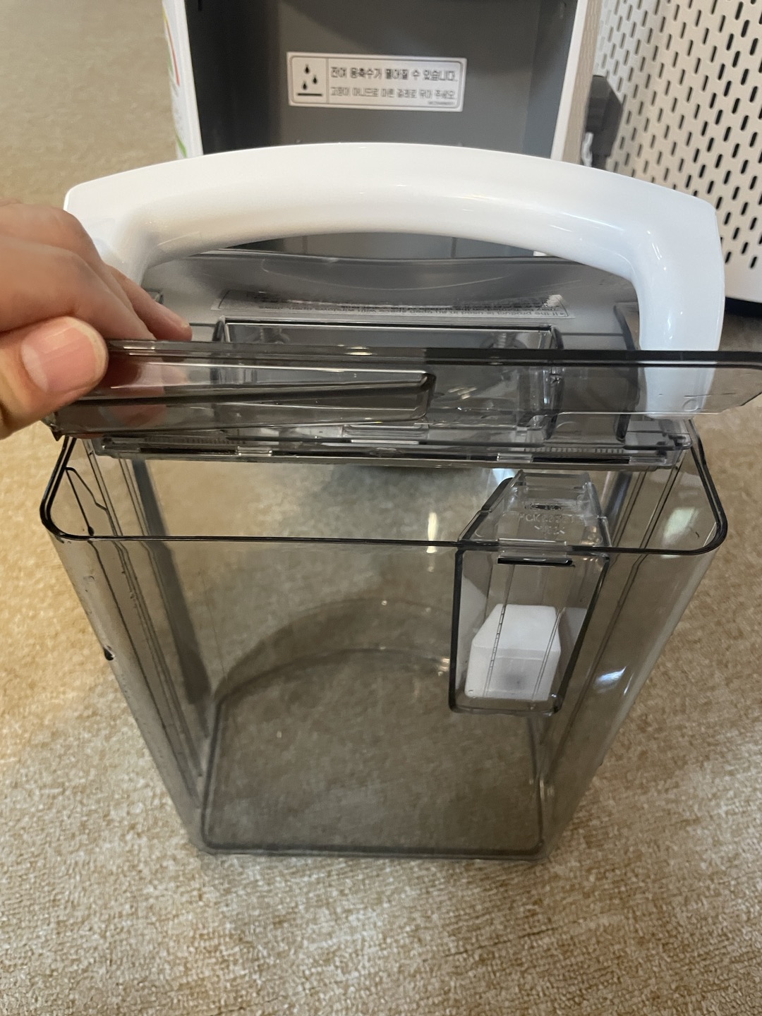 이건 5L짜리 물통인데요 , 하얀색 손잡이를 댕기면 가볍게 물통이 분리되는 구조로 되어있어 물통 비울때나 , 물통 장착할때도 아주 편리하게 되어있습니다.