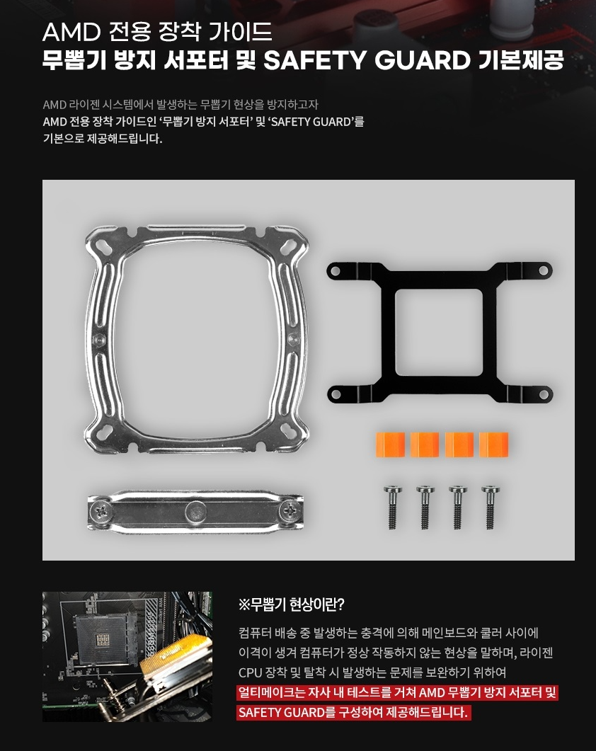 AMD 전용 장착 가이드가 기본 제공되며 , 무뽑기 방지 서포터 및 세이픠 가드가 제공이 됩니다.