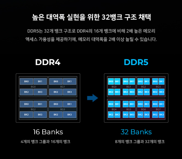 더 낮은 전력 소비: DDR5는 DDR4보다 약 30% 적은 전력을 사용