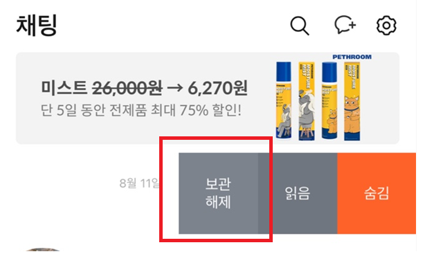 여기서 보관을 누르게 되면 조용한 채팅방 기능이 활성화 됩니다.