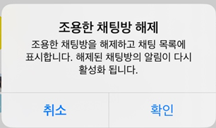 다시 조용한 채팅방 기능을 해제하려면 조용한 채팅방에 설정되어있는 채팅창을 손가락으로
