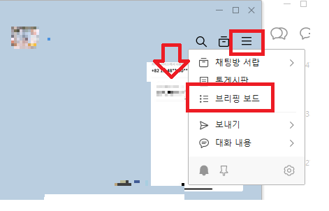 1. 우측의 짝대기 3개 아이콘을 클릭 후에 브리핑보드를 클릭합니다.