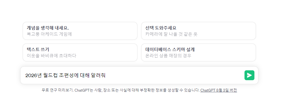 1) 1)챗GPT에 접속하여 아래와 같이 2026년 월드컵 조편성에 대해 알려줘 라고 질문을 했더니
