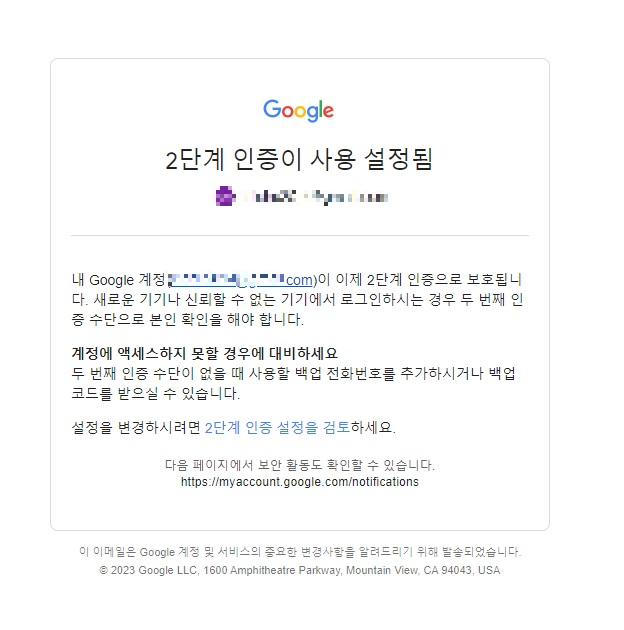 9. 2단계 인증 설정이 완료 되었음을 메일로 전송되어 확인 할 수 있습니다.