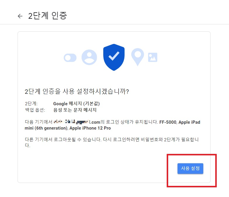 8. 2단계 인증을 사용 설정하는지 물어봅니다. 당연히 사용설정을 클릭합니다.