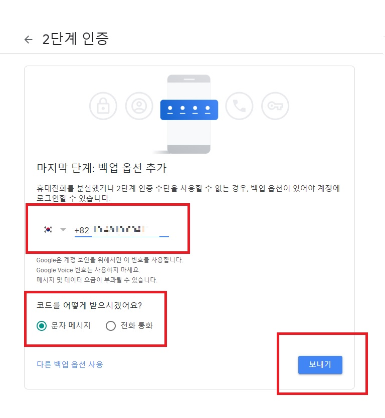 6. 휴대전화를 분실하거나 , 2단계 인증 수단을 사용 할 수 없는 경우에 대한 백업 옵션을 선택해줍니다.