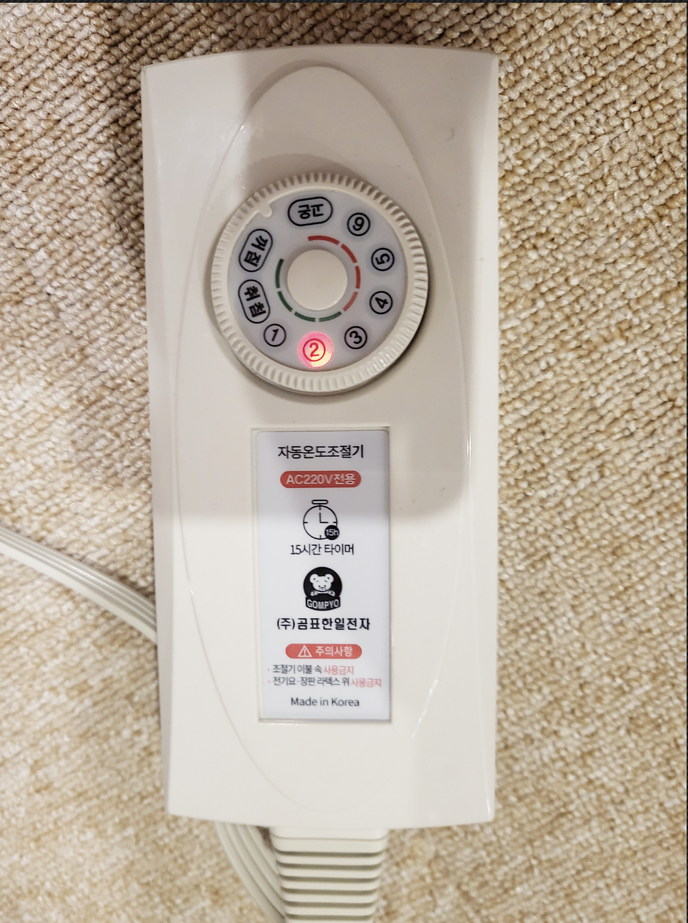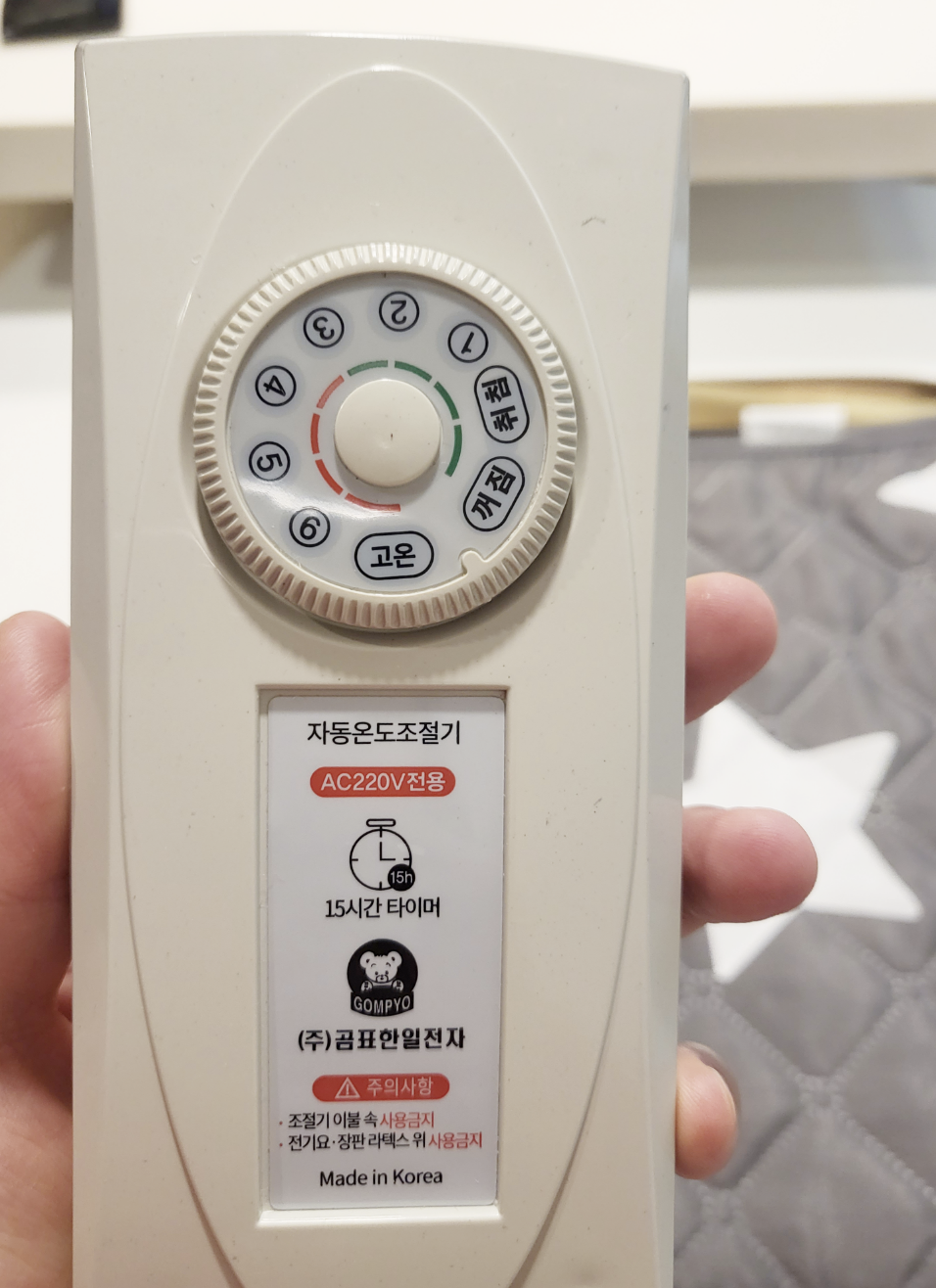 중국 제품이 아닌 국산 제품입니다 . 메이드 인 코리아~~ 라고 박혀있네요 , 15시간 타이머 기능이 들어가있고요 , 온도 조절은 8단까지 조절이 됩니다. 기능은 아주 간단하고 심플합니다.