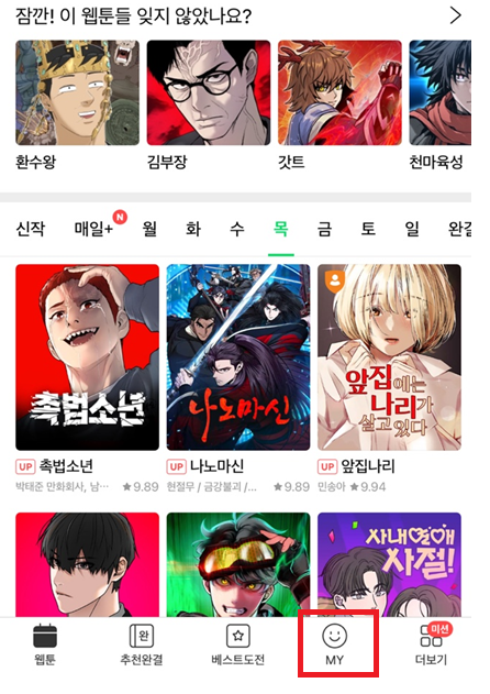 1. 네이버 웹툰 또는 네이버 시리즈 앱에 실행하여 하단 메뉴 - MY 메뉴를 선택합니다.