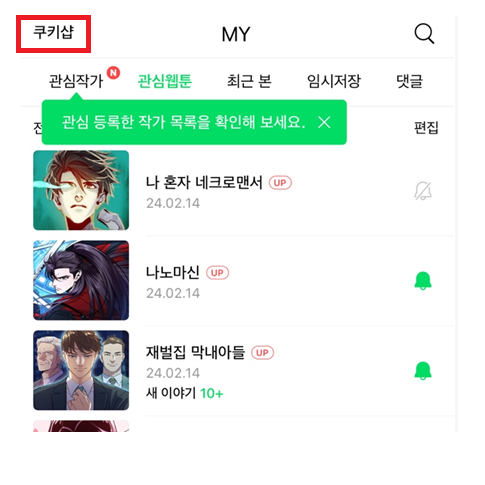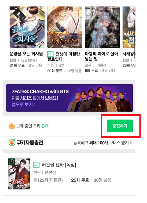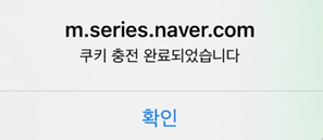 3. 네이버시리즈 또는 네이버웹툰으로 이동하게 되며 , 화면 중앙에 쿠키 충천 버튼을 선택합니다.