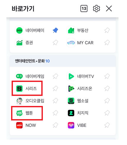 2. 하단으로 스크롤하다보면 엔터테인먼트,문화- 시리즈S , 웹툰이 나옵니다.