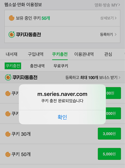 네이버 쿠키가 결제가 완료되면서 쿠키가 충전됩니다.