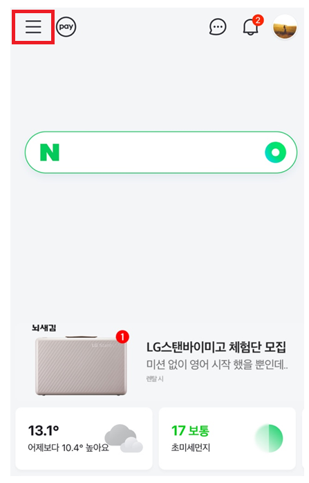 1. 네이버 앱 접속하여 좌측 상단의 선3개 메뉴를 선택합니다.
