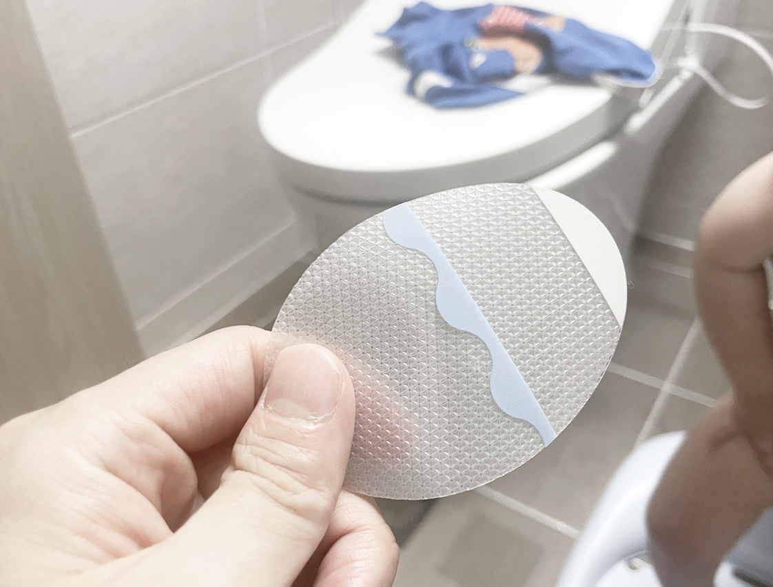 3. 방수 스티커 붙인 사진인데.. 저희 아이가 좀 많이 붙이는 걸 싫어해서 움직이다보니 정확히 중앙에 맞지는