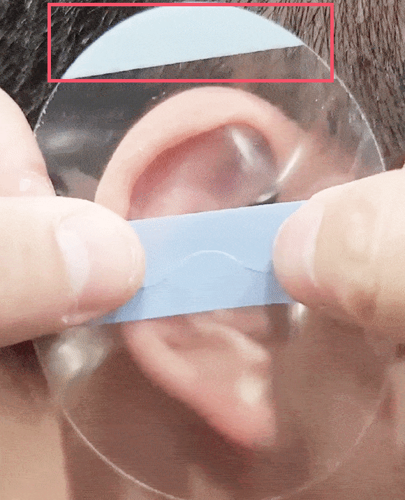 2. 아기 귀에 맞게 붙인 뒤 상단의 반원 스티커를 제거해줍니다.