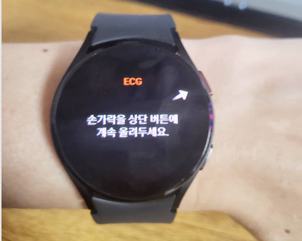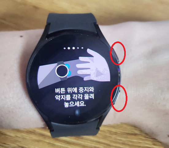 갤럭시워치4 옆에 있는 버튼 위에 중지와 약지를 각각 올려 놓으면 인바디 측정이 시작됩니다.^^