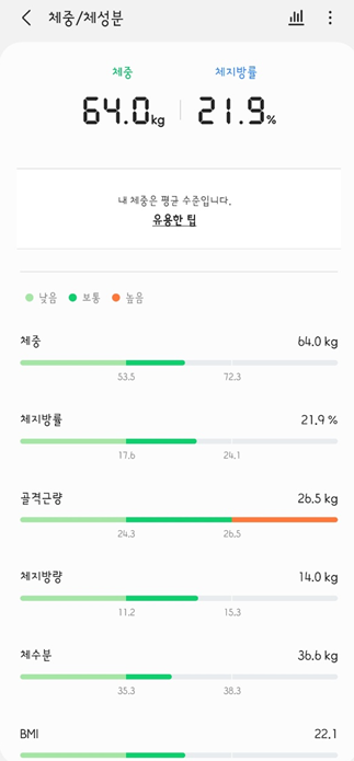 자 이렇게 삼성헬스 앱에서도 인바디 측정 결과를 확인 할 수 있습니다.