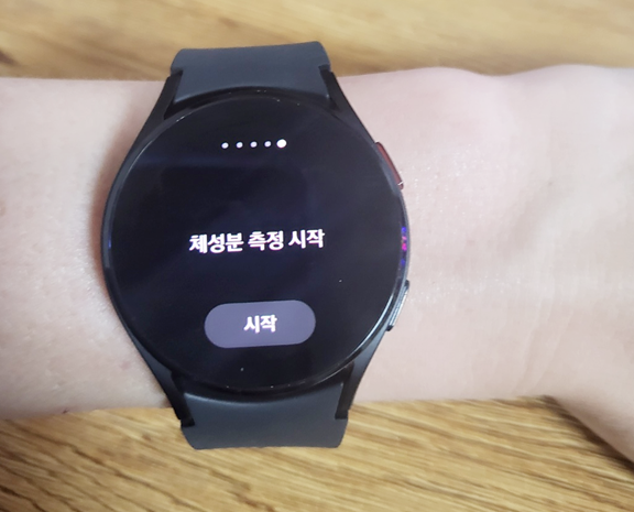 시계 화면 우측으로 화면을 밀면 체성분 측정 메뉴가 나옵니다. 시작을 눌러봅니다.