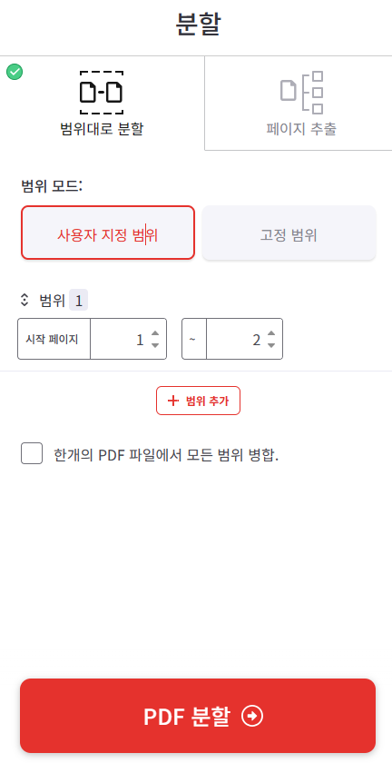 1)사용자 지정 범위 : PDF 파일을 분리할 페이지를 사용자가 임의대로 설정하여원하는 분할 페이지를 설정 할 수 있는 기능입니다.