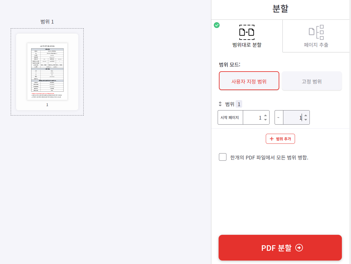 4. PDF 파일의 분할 범위를 선택한 후에 PDF 분할 버튼을 클릭합니다. 저는 사용자 지정 범위를 선택하여 1페이지만 분할 선택하였습니다.