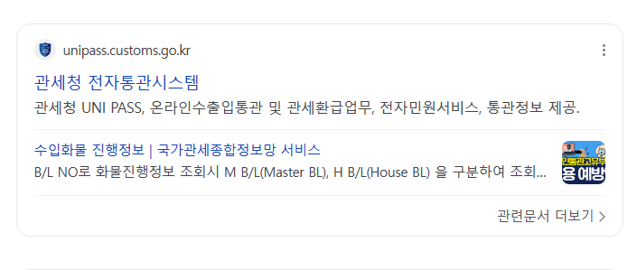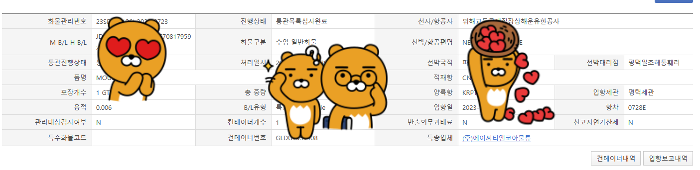 아래 자료 화면이 M B/L - H B/L 운송장 번호를 입력하여 나온 통관 조회 내역입니다.