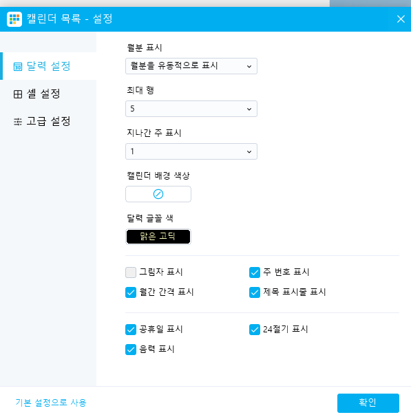 폰트 , 달력에서 표시될 행 , 지나간 주 표시 , 캘린더 배경 색상등을 설정 할 수 있습니다.