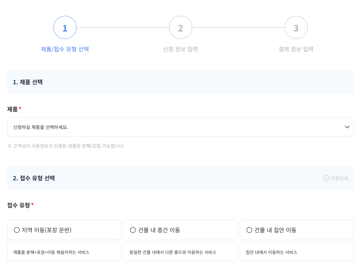 2. 이전/설치를 진행할 모델명 선택과 이전 유형을 선택합니다 . ( 지역 이동, 층간 이동 , 건물 내 집안 이동 )