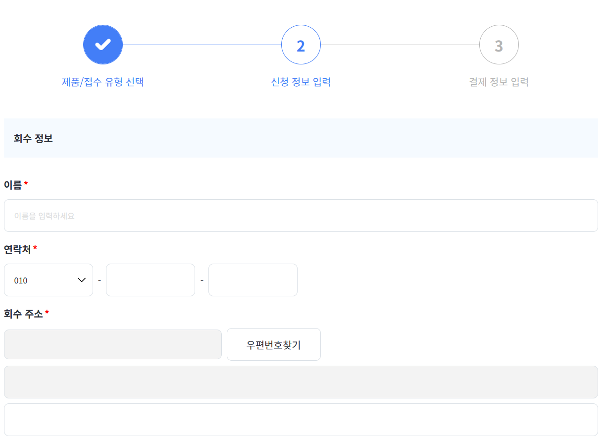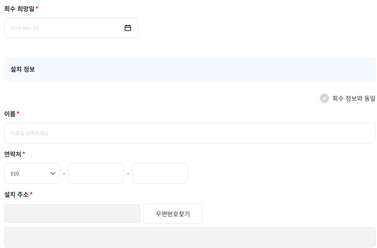 3. 이전/설치 회수 정보와 , 이전 설치 할 곳의 정보를 입력합니다.