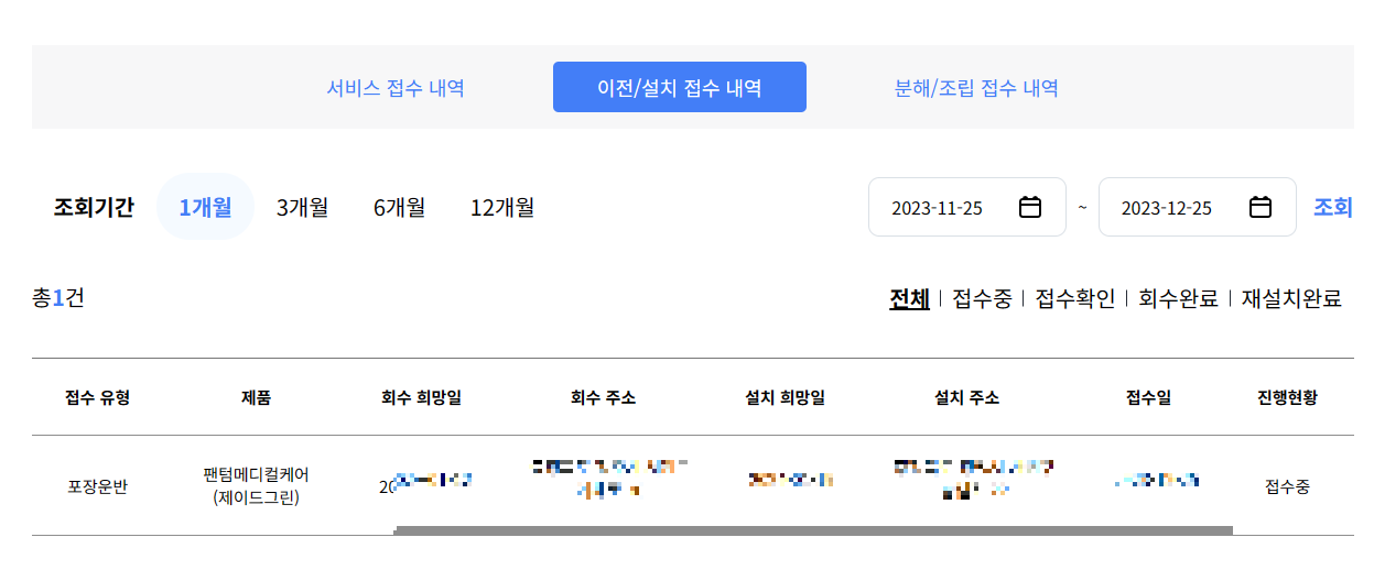 4. 이전/회수 정보 입력 하고 나서 , 이전/설치비용을 결제하면 아래와 같이 최종적으로 접수가 완료되며최종적으로 접수가 확정되면 , 카톡으로 접수 완료 톡이 오는데 접수 신청 후 하루정도 걸리더라구요.이점 참고해주세요