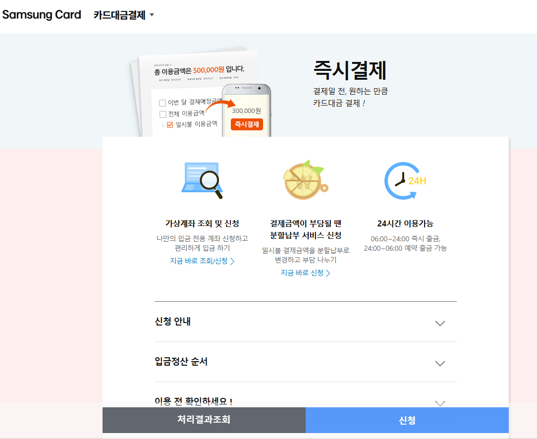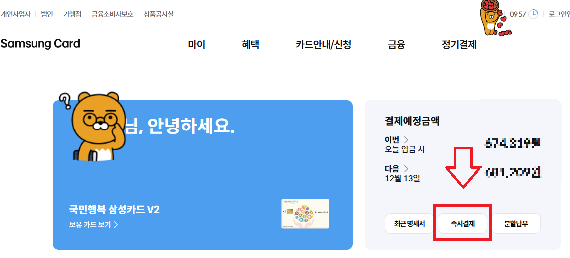 3. 로그인을 하시면 메인페이지에 즉시결제 메뉴를 선택합니다.