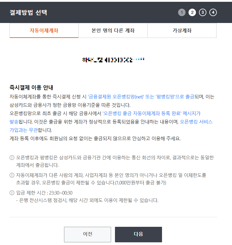 7. 결제 방법을 ( 자동이체계좌 , 본인 명의 다른계좌, 가상 계좌 등 ) 선택하고 다음으로 넘어가면