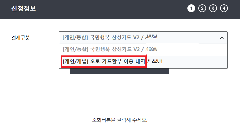5. 오토 카드할부 이용 내역을 선택하고 조회를 합니다.