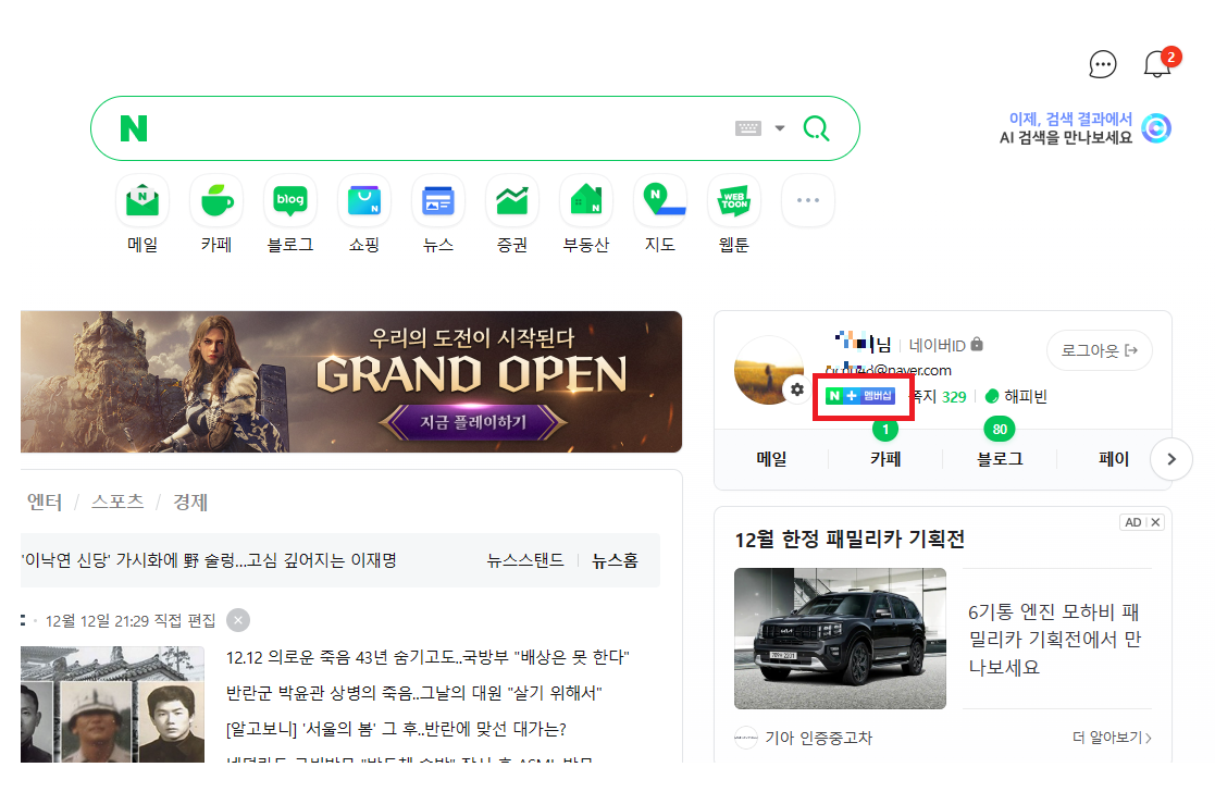2. 네이버 프로필란에 네이버플러스멤버십 아이콘을 클릭합니다.