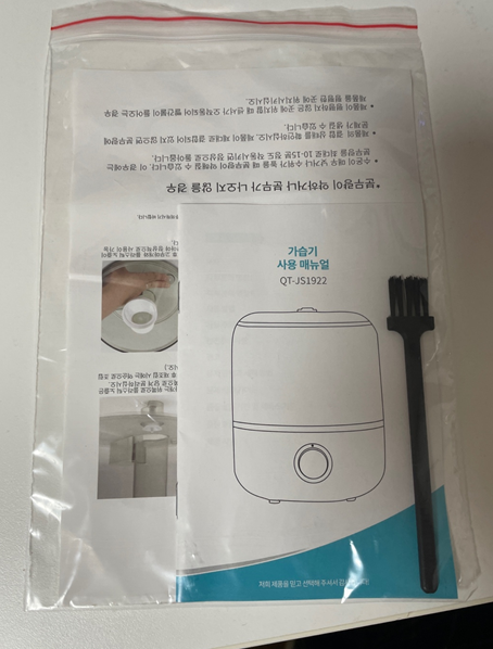 시프이컴 (QT-JS1922 ) 제품의 구성품은 가습기 본체와 설명서, 청소솔로 구성되어있습니다.