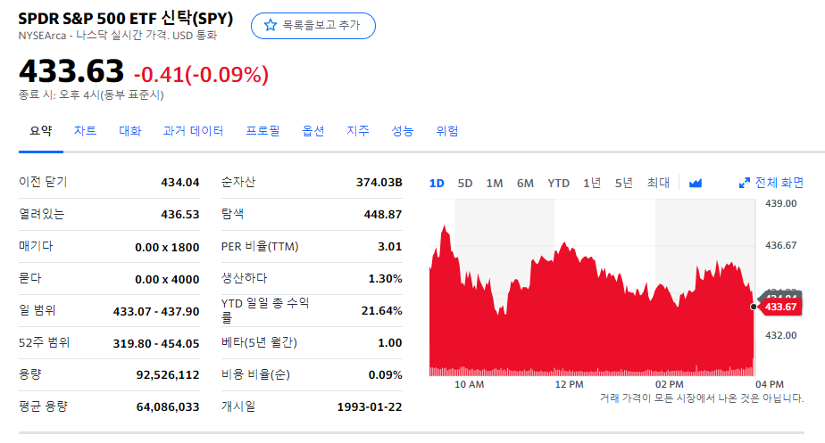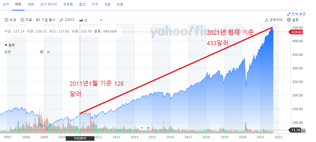 차트에서 보시다시피 2011년 1월에 SPY 주식을 1주당 126달러에 구매를 하시고 장기보유를 하셨다면 현재 2021년 9월 22일 기준 433달러이니까 350%정도 오른겁니다 . 역쉬 미국의 좋은 ETF는 장기투자가 아주 매력적입니다.