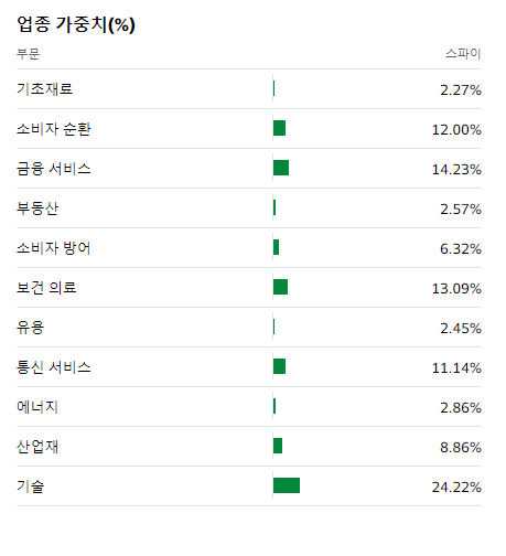 비중 큰 순으로 보면 기술주 24.22%, 금융 14.23% , 보건의료 13% , 소비자 순환 12% , 통신서비스 11% 등으로