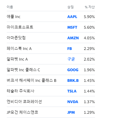 종목 비율로 보면 애플이 5.9프로 , 마소가 5.6%, 아마존이 4% , 페북 2.2% , 구글 4% , 버크셔 해서웨이 1.45% , 테슬라 1.44% , 엔비디아 1.37% , JP모던 체이스엔코 1.29% 로 등입니다.