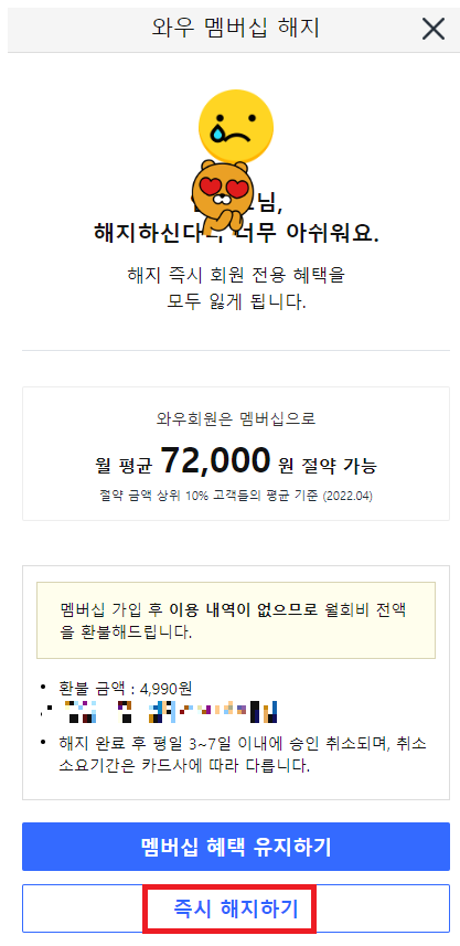 6) 드디어 와무 멤버십이 해지 완료되었습니다.