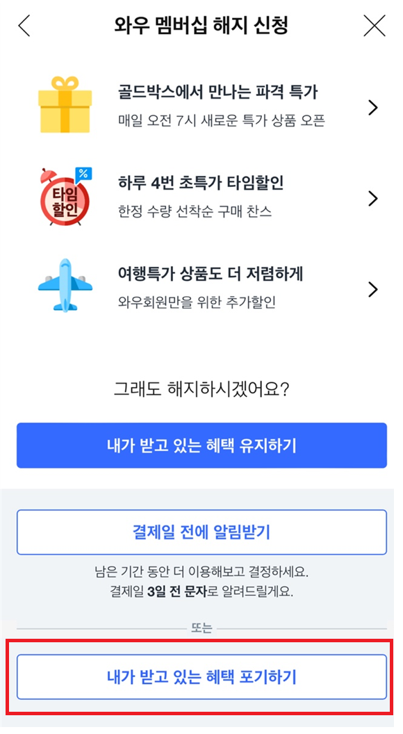 4)모바일 역시 여러번 해지할건지 되묻습니다.하단의 혜택 포기하고 해지하면 와우 멤버십은 해지됩니다.