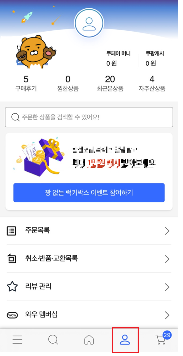 1)쿠팡 어플을 실행하고 , 하단의 마이 쿠팡 아이콘을 선택합니다.