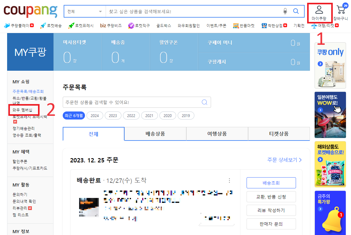 2) 로그인 이후 - 마이쿠팡 - 와우 멤버십을 클릭합니다.
