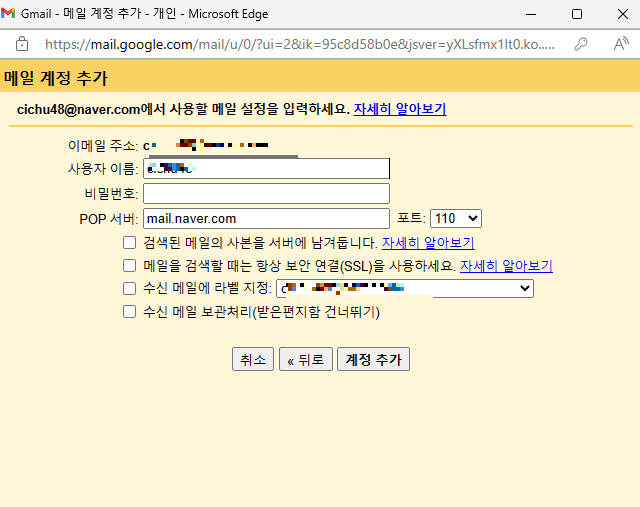 6. 추가하려는 이메일의 정보를 입력 ( 사용자이름 ( 아이디 ) , 비밀번호 , 포트번호 )