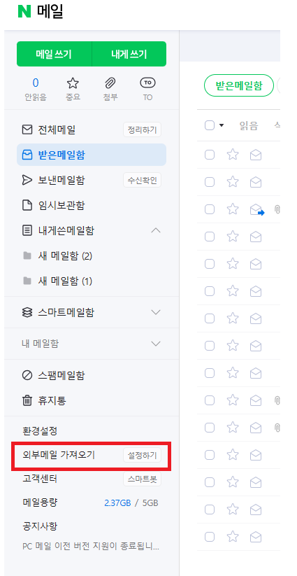 1. 외부메일 가져오기- 설정하기 를 선택합니다.