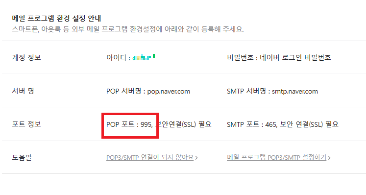 2.POP3/IMAP 설정에 보면 포트번호를 아래와 같이 확인이 가능합니다.