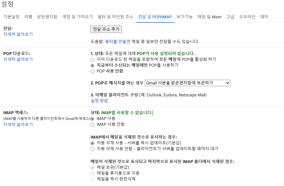 2. 전달 및 POP/IMAP 메뉴에서 POP 및 IMAP 사용 선택을 합니다.