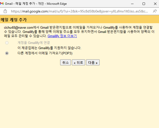 5. 다른 계정에서 이메일 가져오기(POP3)를 선택합니다.