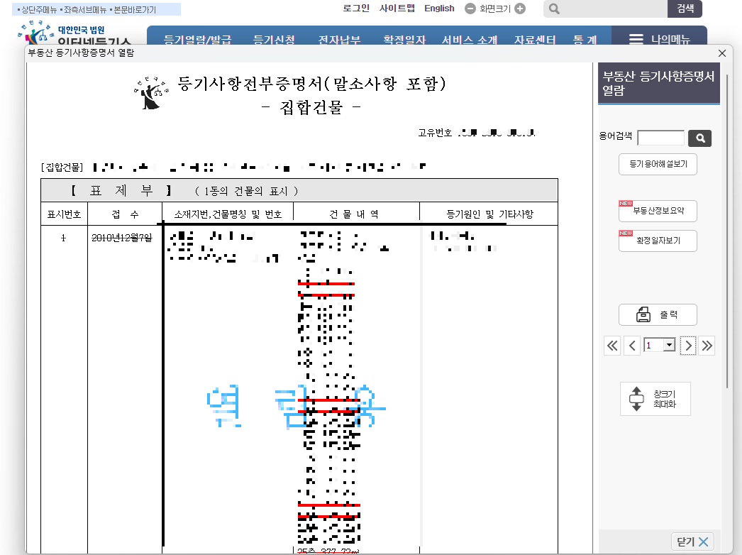 8. 결제를 진행하면 등기부등본(등기사항전부증명서)서를 열람 가능하며 , 출력도 가능합니다.