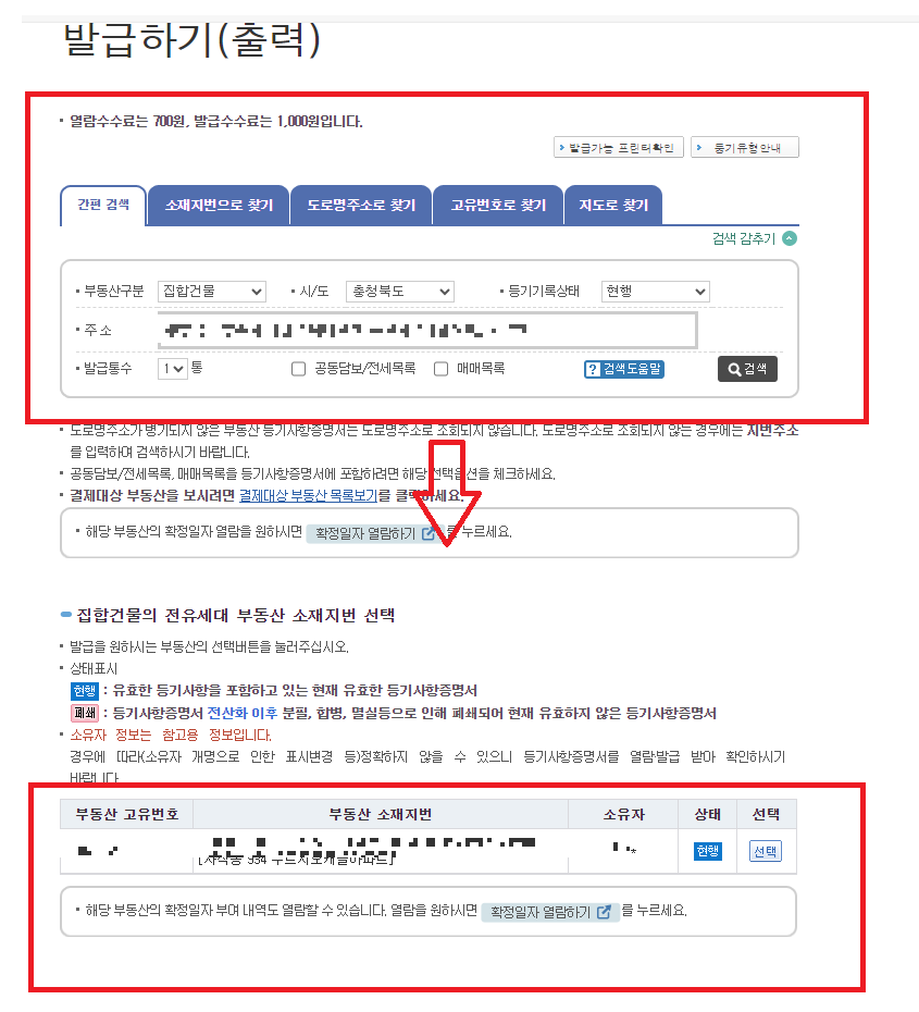 3. 등기부등본을 열람할 주소를 선택합니다.열람 수수료 700원, 발급수수료 1,000원의 수수료가 발생됩니다.