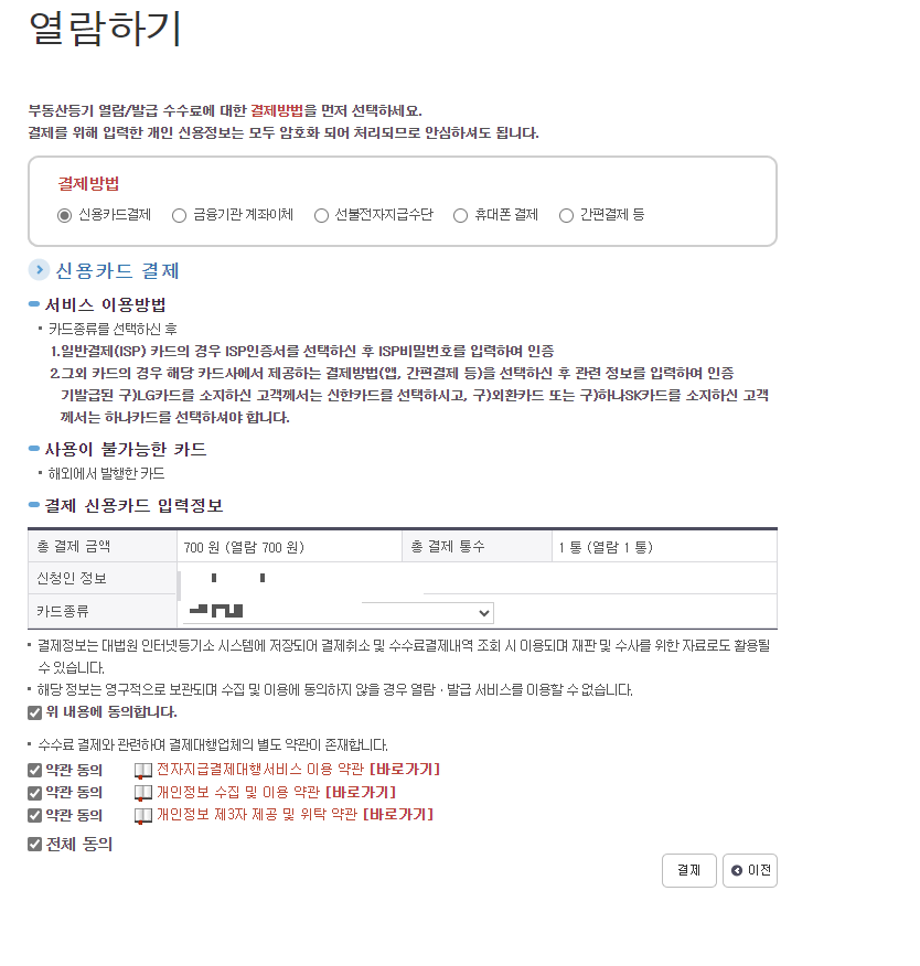 7. 열람하기 메뉴로 넘어오게 되며 , 수수료를 결제를 해야합니다.결제수단을 선택하여 결제진행합니다.